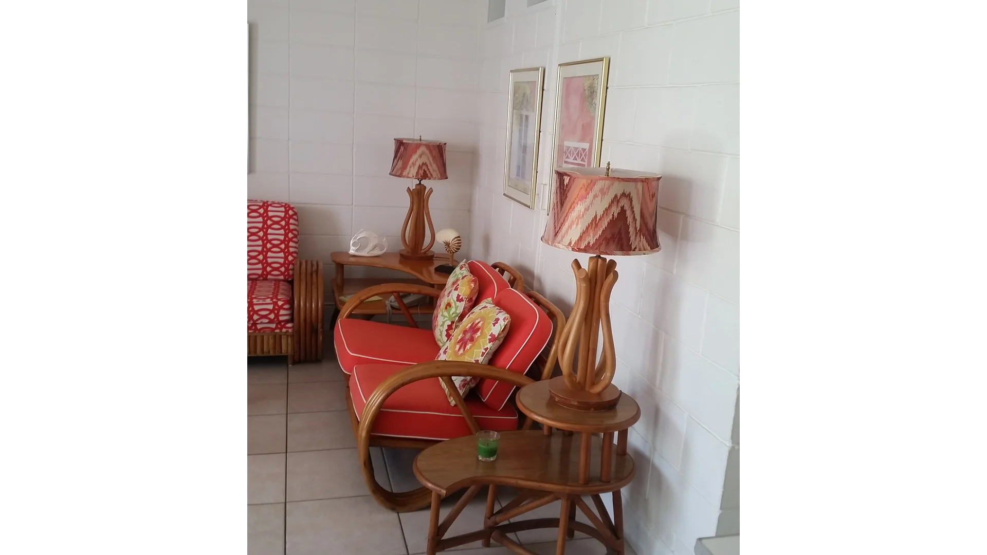 Our Pretzel Loves Apostrophe room is furnished with Paul Frankl’s Pretzel Sofa with 5 strands designed in the 40’s, perfectly combined with Heywood Wakefield Mid Century Modern, apostrophe end table, coffee table and lamps, all of these mid-century modern vintage pieces, complement each other to create a very tropical retro ambiance.
